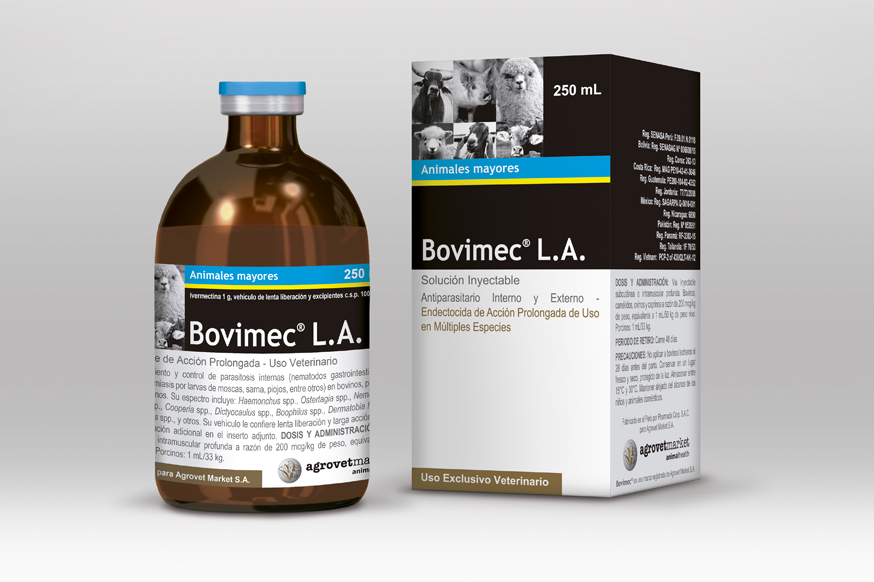 Tratamiento y control de parasitosis internas (nemátodes gastrointestinales y pulmonares), sarna y garrapatas (y otros ectoparásitos). su espectro incluye: haemonchus spp., ostertagia spp., trichostrongylus spp, cooperia spp., haemonchus spp., oesophagostomum spp., dyctiocaulus viviparus, dermatobia hominis, psoroptes bovis, boophilus microplus, entre muchos otros parásitos internos y externos. su vehículo oleoso confiere a bovimec® l.a. una liberación lenta y prolongada, extendiendo su acción hasta por 42 días.